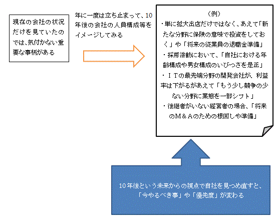 足元の今の会社の状態だけを見ていたのでは、これらの視点には気付かないでしょう。10年後という未来からの視点で自社を見つめ直したからこそ、今やるべき事や優先度が変わってきたのだと思います。ぜひ、年に1度は10年後の会社の人員構成等をイメージするようにして下さい。